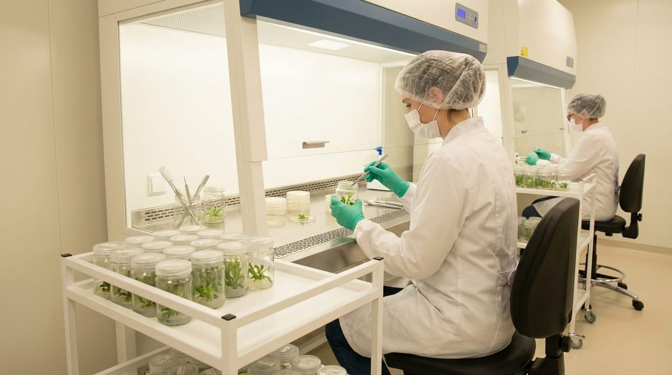 Meristem and nodal culture in sterile laboratory conditions. We produce genetically uniform, disease-free plantlets with multiplication rates optimized for each species. Ideal for building clean stock or scaling production.